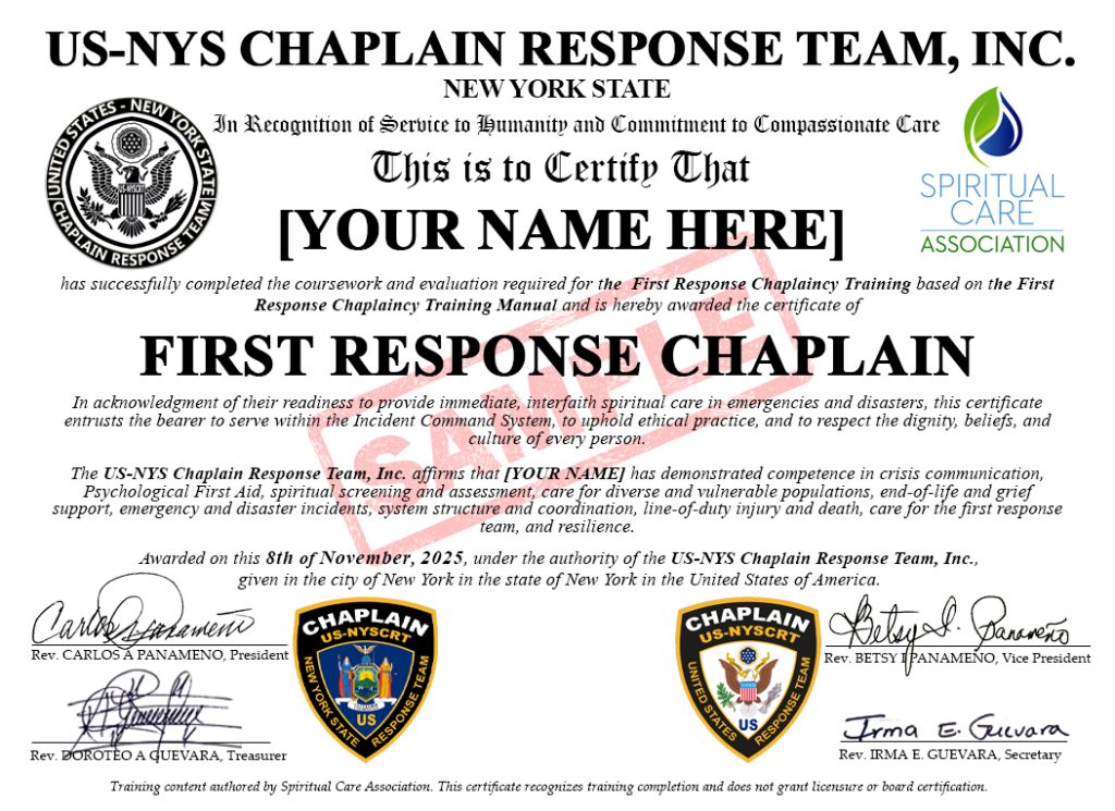 Upon successful completion and assessment, participants receive the First Response Chaplain certificate (training recognition; not licensure or board certification).