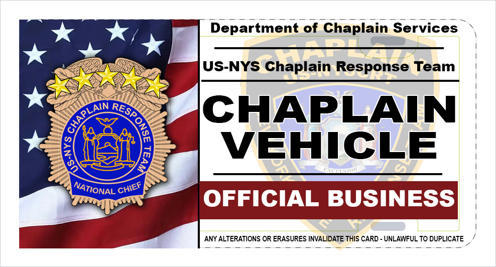 The US-NYS Chaplain Response Team (US-NYSCRT) issues vehicle identification placards solely for the purpose of identifying our trained chaplains while engaged in official chaplaincy duties, such as emergency response, community outreach, and crisis ministry.